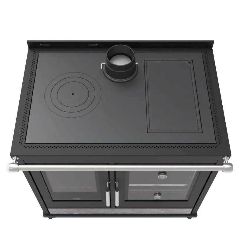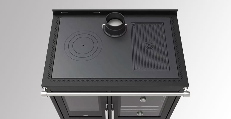 Il piano superiore integra una robusta piastra in ghisa smaltata alimentare, perfetta per grigliare la carne oppure altri cibi direttamente sulla cucina , sfruttando il calore prodotto dalla combustione a legna.
