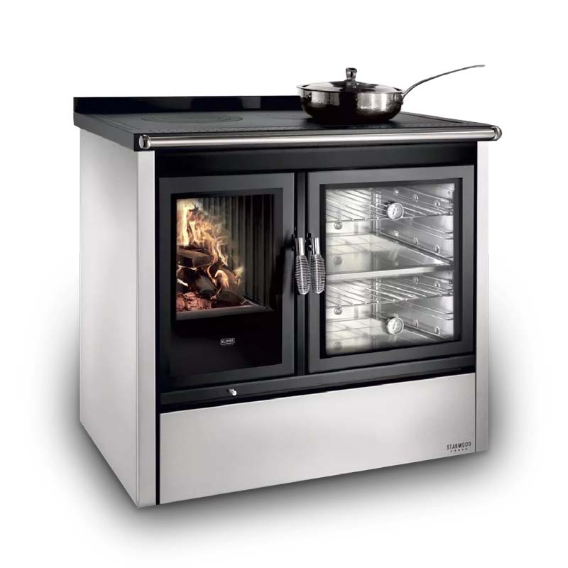 La cucina a legna Klover Star 90 Inox consente di cucinare pietanze su piastra e forno, riscaldare cucina e ambienti circostanti.