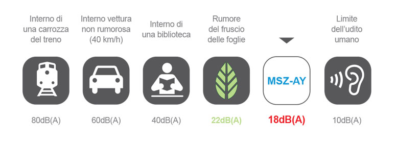 I 18dB(A) raggiunti dal modello MSZ-AY sono più silenziosi del rumore generato dal frusciare delle foglie nel vento, rendendo il climatizzatore di fatto non udibile dagli occupanti della stanza.