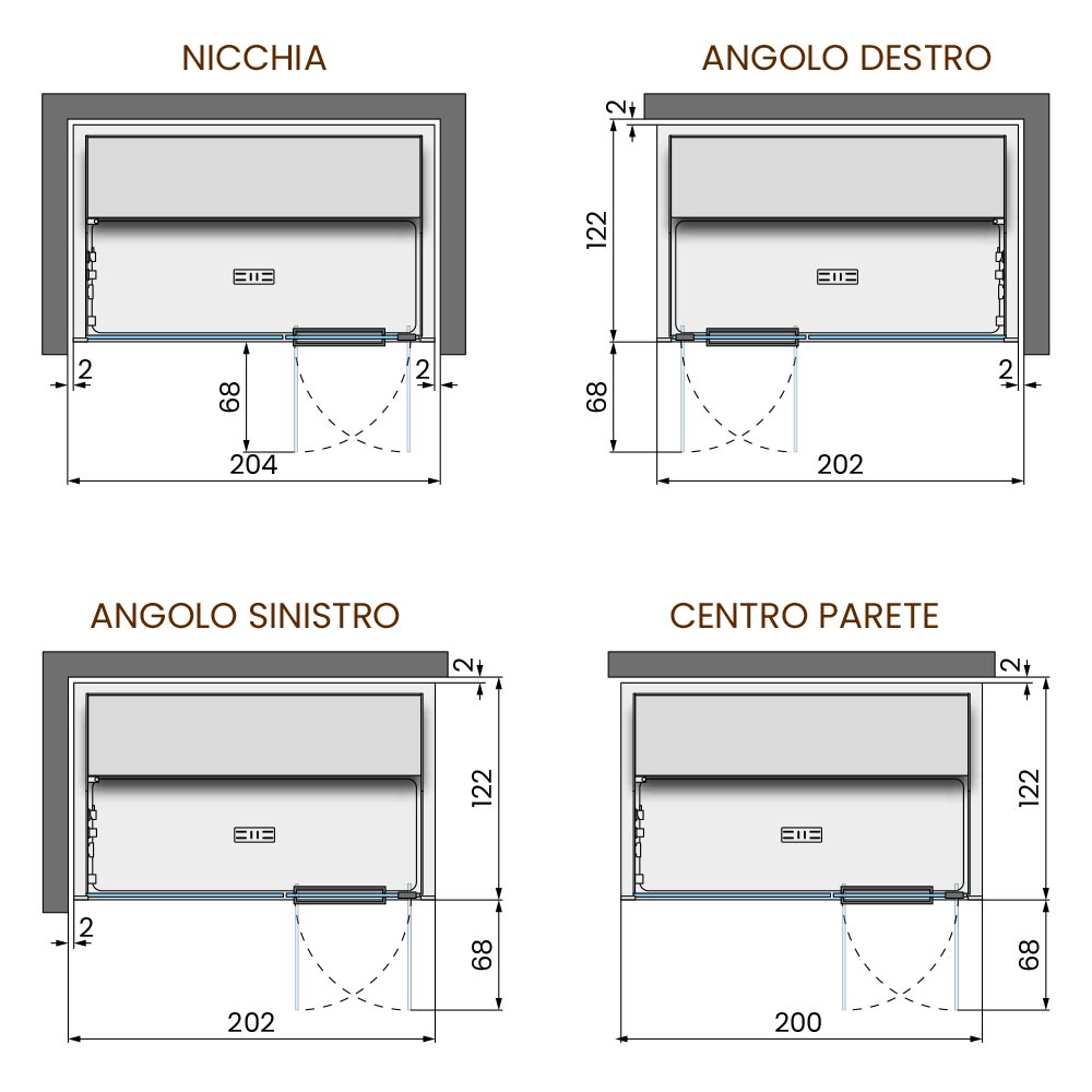 - Installazione: nicchia, angolo destro, angolo sinistro e centro parete.