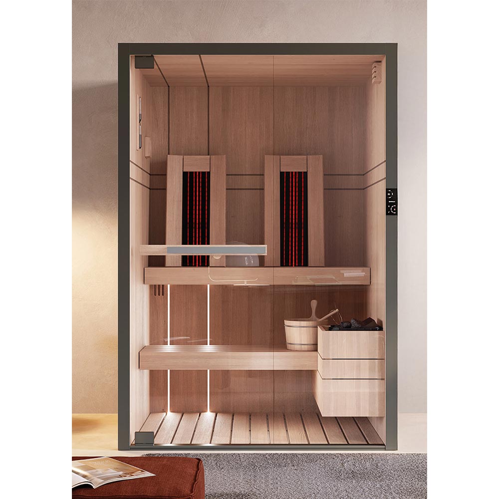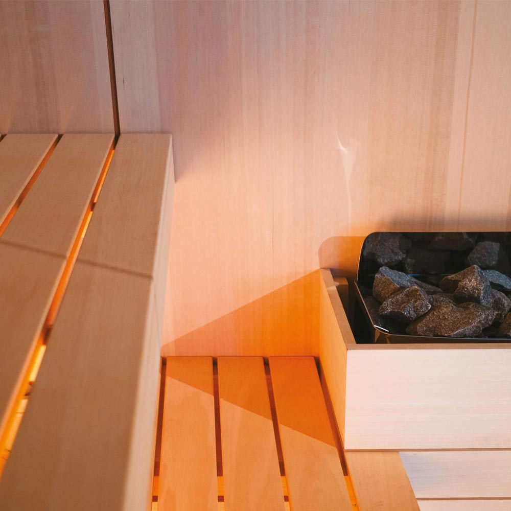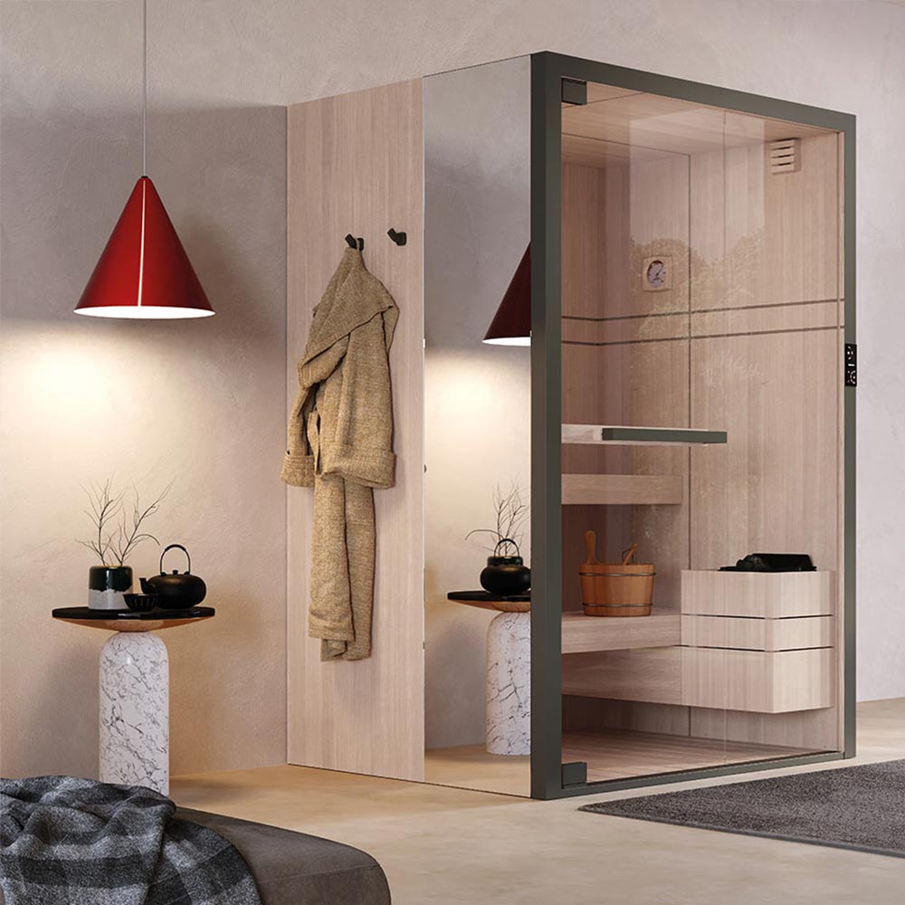 Realizzata con legni pregiati come Abachi o Hemlock, la struttura interna è pensata per garantire un calore avvolgente e uniforme, piacevole al tatto e resistente nel tempo.