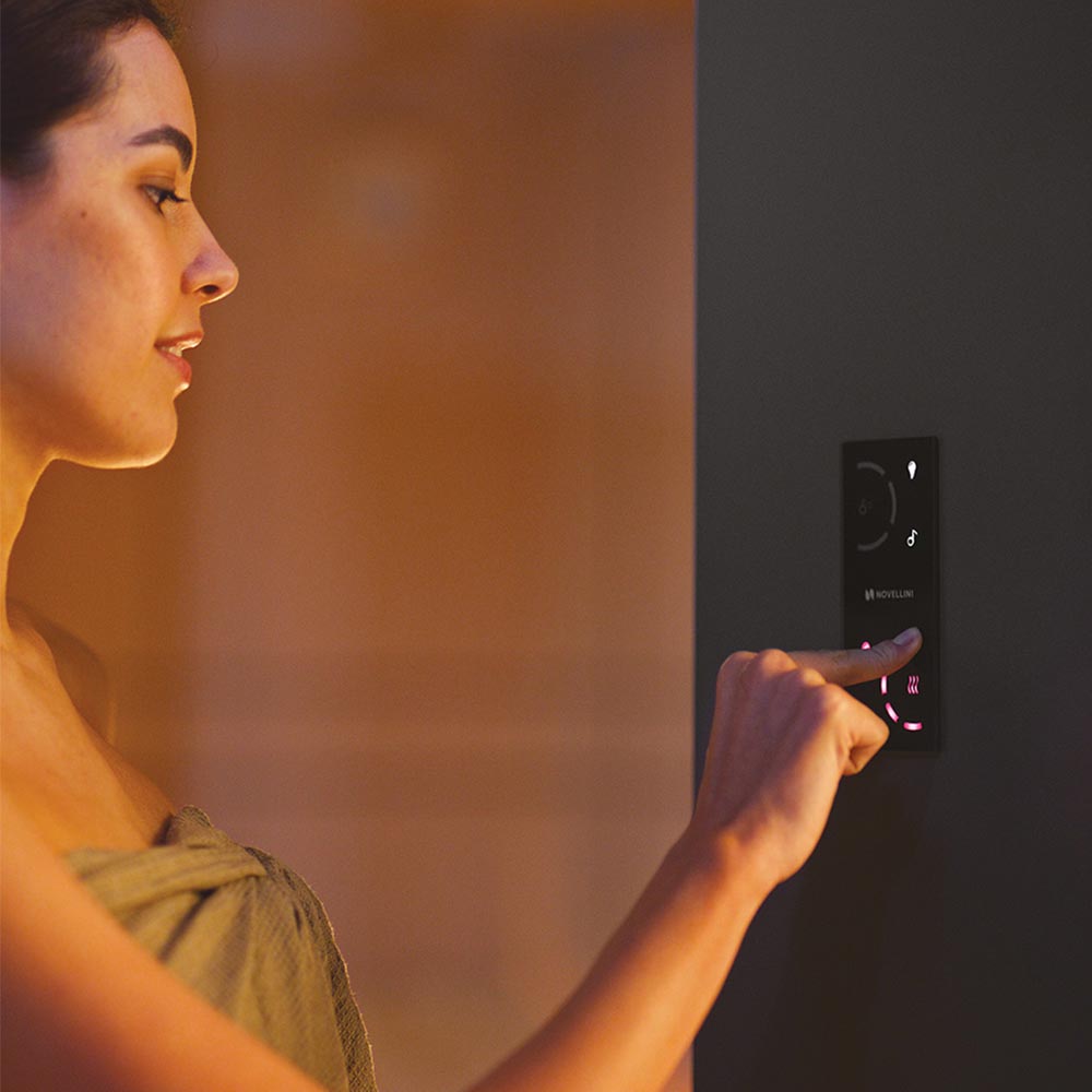 Il cuore della sauna è gestito da un pannello di controllo digitale, semplice e intuitivo, che permette di regolare temperatura, timer e funzioni accessorie.