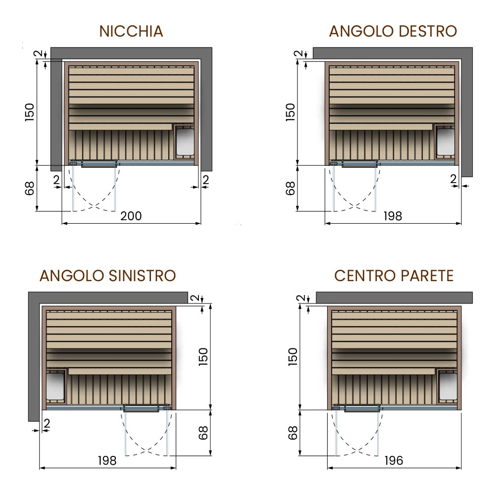 - Installazione: nicchia, angolo destro, angolo sinistro e centro parete.