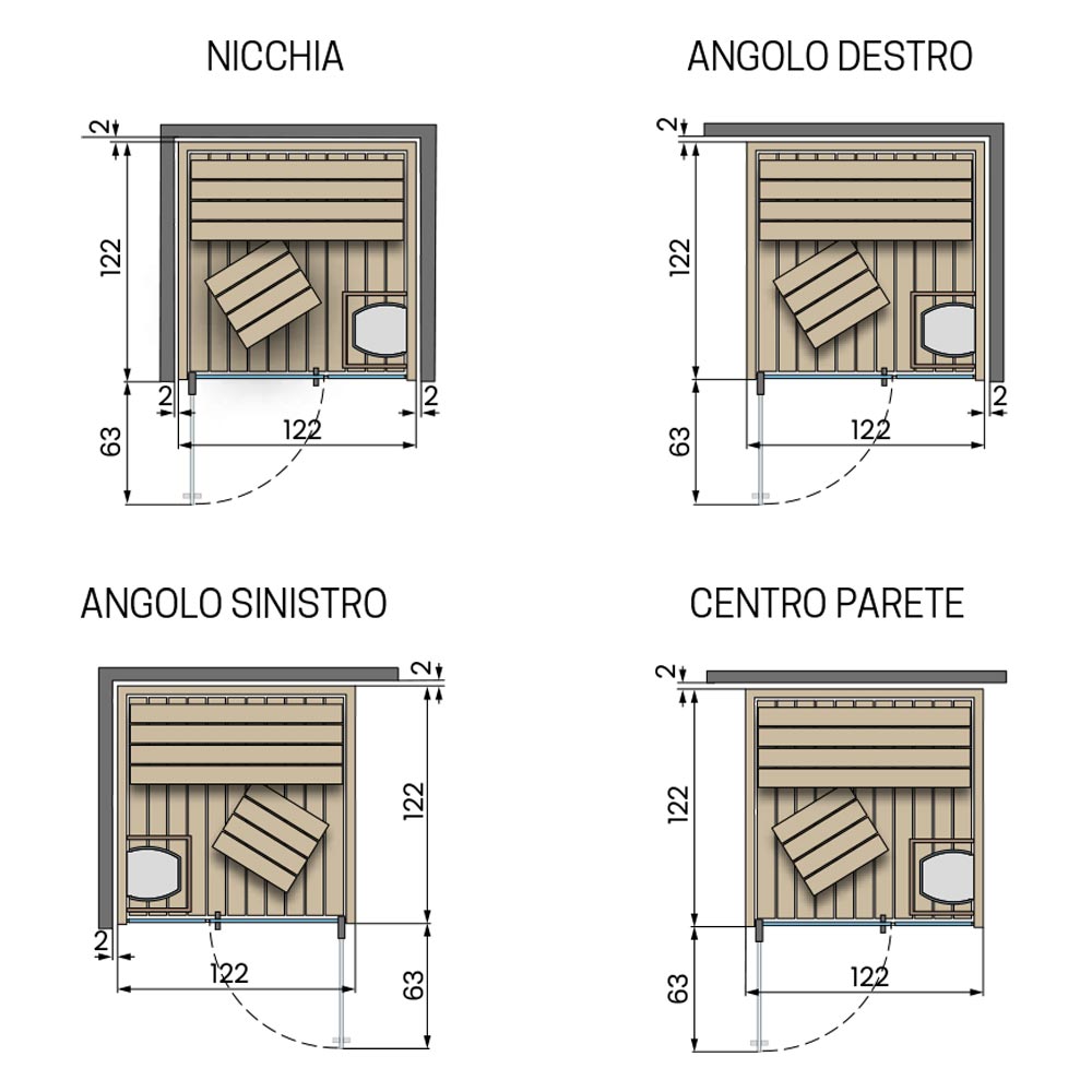 - Installazione: nicchia, angolo destro, angolo sinistro e centro parete.