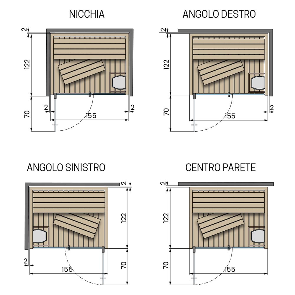 - Installazione: nicchia, angolo destro, angolo sinistro e centro parete.