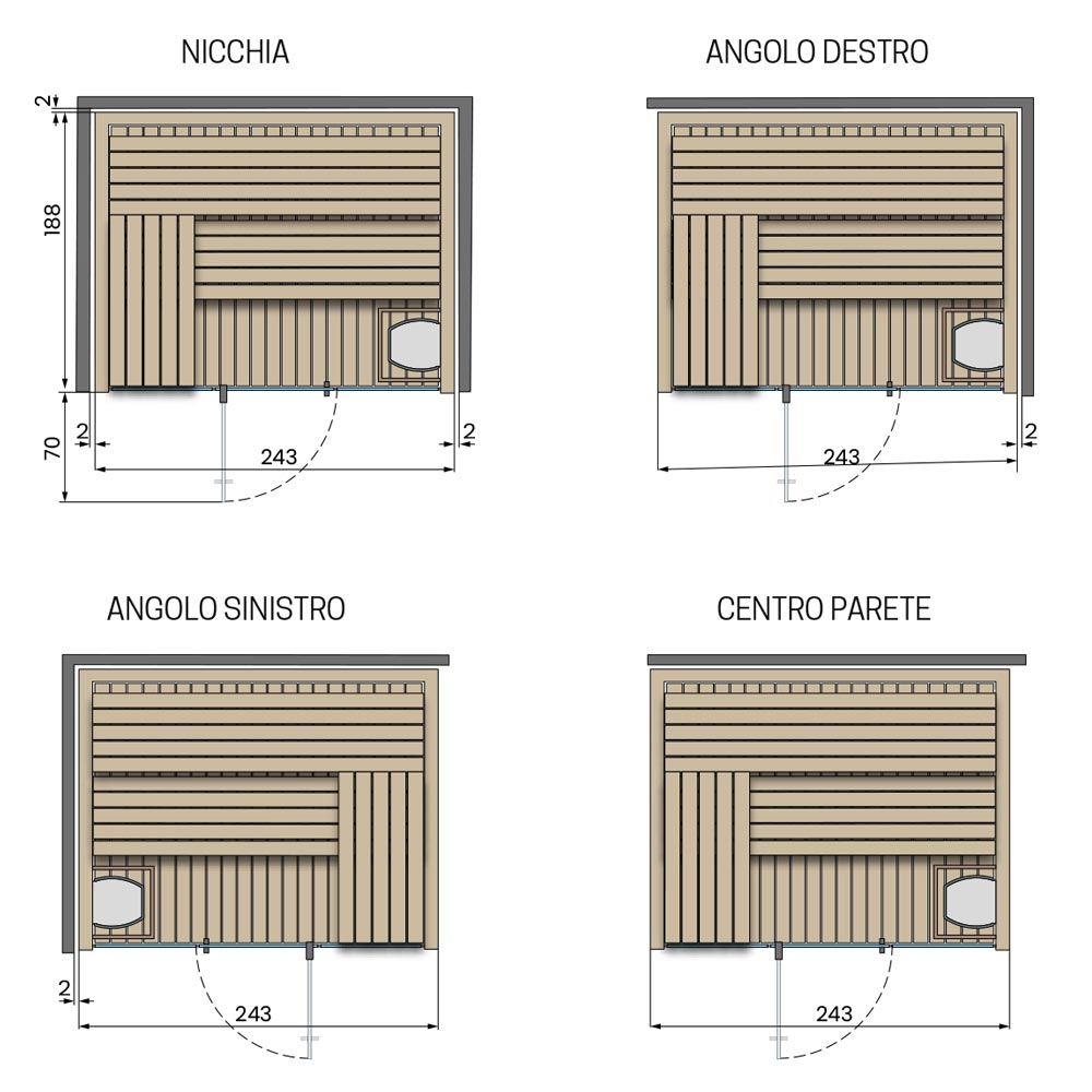 - Installazione: nicchia, angolo destro, angolo sinistro e centro parete.