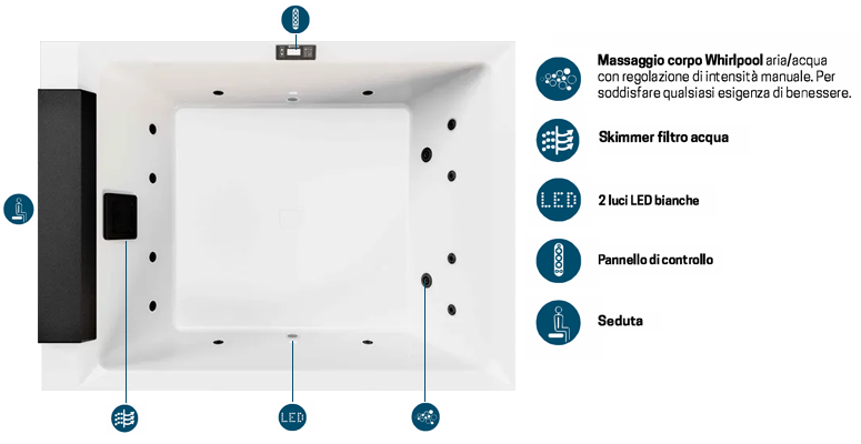 - 14 bocchette per massaggio Whirlpool aria/acqua con regolazione di tempo e intensità manuale o automatica.