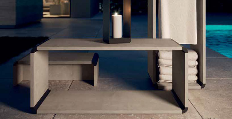 Pensato per l’utilizzo a bordo vasca, questo complemento offre un piano d’appoggio elegante e funzionale.
