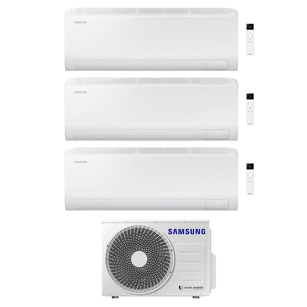 Climatizzatore Trial Split Samsung Inverter Cebu S2. Set composto da n°3 unità interne AR70F096C1AWNEU da 9000 btu in classe energetica A+++/A++, con gas ecologico R-32 e Wi-Fi integrato; unità esterna 3 attacchi AJ052TXJ3KG da 5,2 kW.